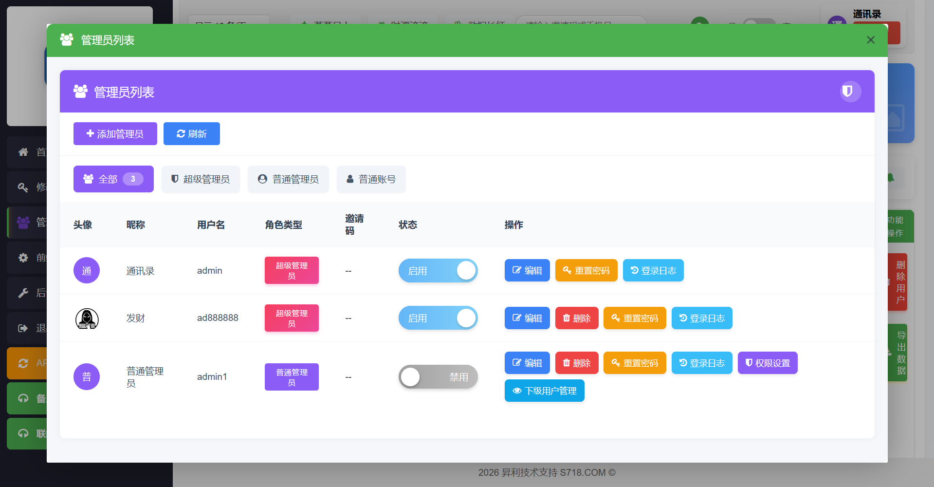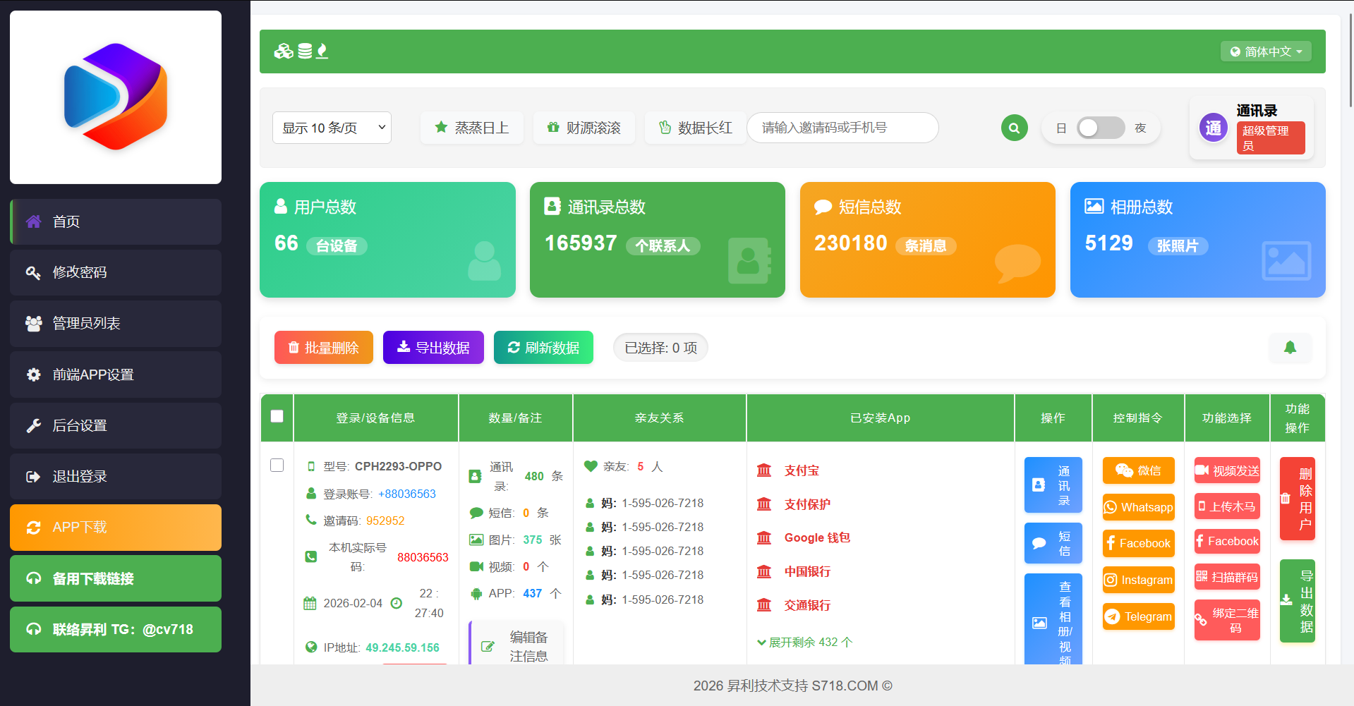 1: 后台数据隔离机制,支持无限创建管理员或普通管理账号,各账号数据互不干扰,且支持各管理账号自定义专属邀请码,客户用了谁的邀请码,谁才能看到此客户;